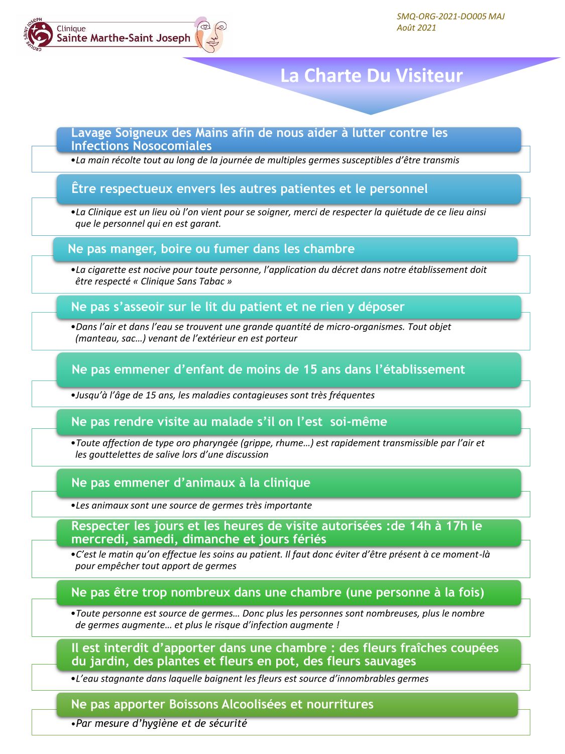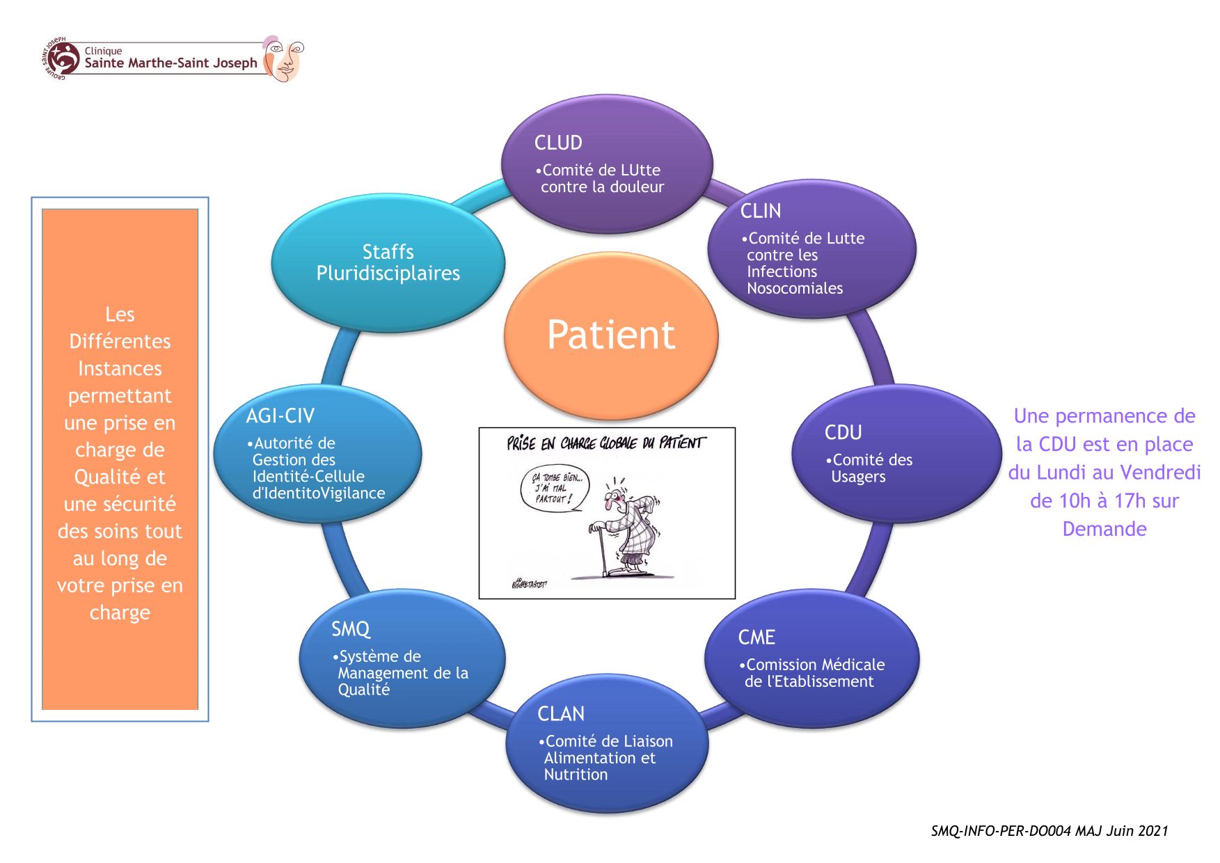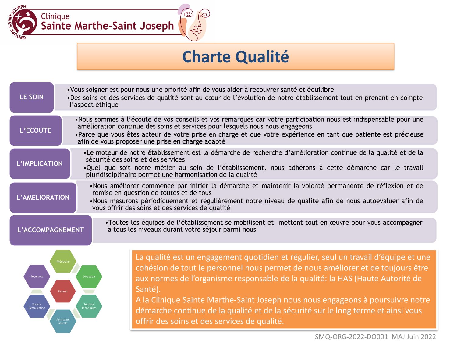 La clinique Sainte Marthe-Saint Joseph a fait de la qualité une de ses priorités depuis de nombreuses années. La qualité fait partie intégrante de la politique et du management de l’établissement. Elle est au cœur de la prise en charge de la patiente et des soins prodigués. L’amélioration par la qualité est ancrée dans nos pratiques depuis longtemps.