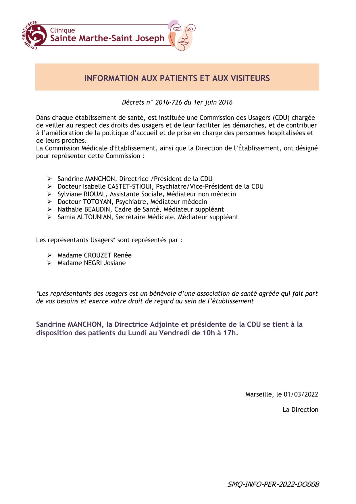 Nous entrons depuis quelques temps dans une approche transversale de la qualité qui est présente à toutes les étapes de la prise en charge de la patiente. L’établissement a mis en place des audits, enquêtes et évaluations internes afin de mesurer son niveau de qualité. Il est donc possible que nous vous sollicitions dans le cadre de l’amélioration de la qualité des soins, afin que vous puissiez partager avec nous votre expérience en tant que patiente.