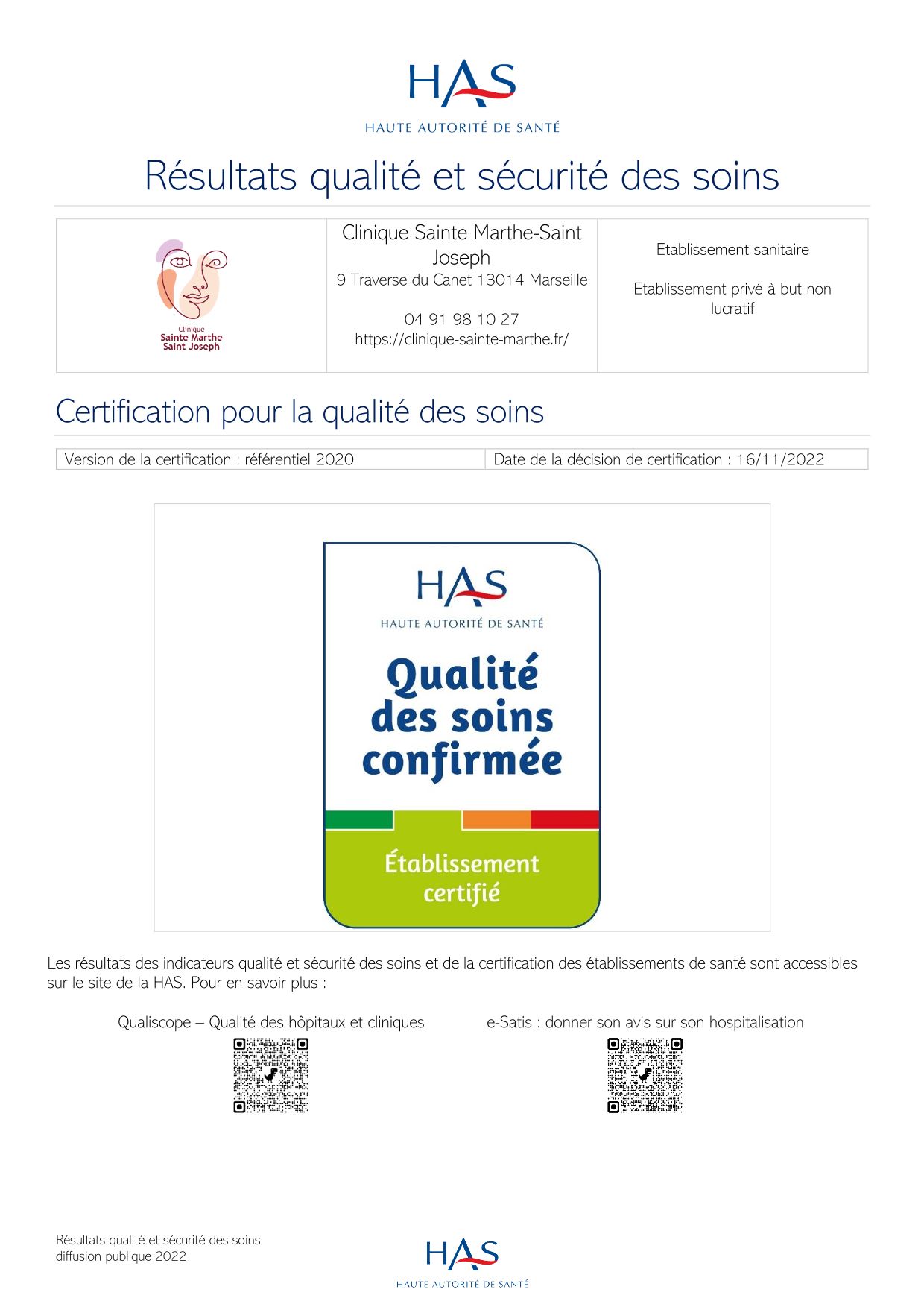 Vous pouvez trouver le détail de notre Certification sur le site de la Haute Autorité de Santé (HAS).